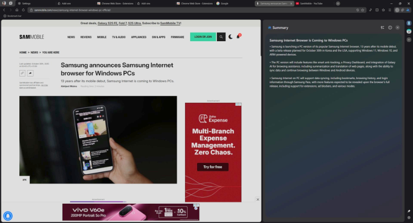 Nowa wersja Samsung Internet na PC oferuje wiele funkcji znanych z wersji mobilnej. Wśród nich znajdują się m.in. inteligentne blokowanie śledzenia, które chroni prywatność użytkownika przed niechcianymi ciasteczkami i trackerami, oraz panel prywatności umożliwiający monitorowanie i zarządzanie zablokowanymi próbami śledzenia. Przeglądarka została również wyposażona w funkcję Browsing Assist, opartą na Galaxy AI, która potrafi streszczać i tłumaczyć strony internetowe w wielu językach.