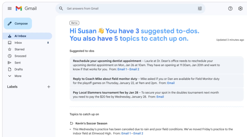 Największą zmianą koncepcyjną jest jednak AI Inbox, czyli zupełnie nowy widok skrzynki, który pojawi się w panelu bocznym powyżej tradycyjnej „Inbox”, oznaczony ikoną z gwiazdką. Zamiast listy pojedynczych wiadomości użytkownik otrzymuje spersonalizowany briefing, który ma natychmiast wyciągać z e‑maili to, co faktycznie wymaga uwagi: bieżące zadania, rachunki, przypomnienia oraz tematy warte nadrobienia. Na górze wyświetla się powitanie z liczbą spraw do przejrzenia i czasem ostatniej aktualizacji, co wzmacnia wrażenie, że skrzynka działa jak dynamiczny pulpit, a nie statyczne archiwum.