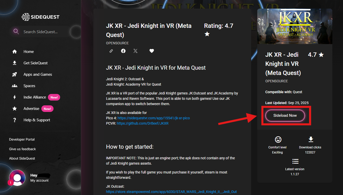 Cały proces odbywa się automatycznie poprzez stronę danego portu z katalogu SideQuest w przeglądarce, która po kliknięciu w przycisk “Sideload Now” prowadzi użytkownika krok po kroku przez wszystkie etapy (w tym włączenie trybu deweloperskiego na goglach, jeśli jeszcze nie zostało to zrobione) i wszystkie niezbędne dane są pobiera i instaluje w tle, co sprawia, że sideloading staje się niemal magicznie prosty.